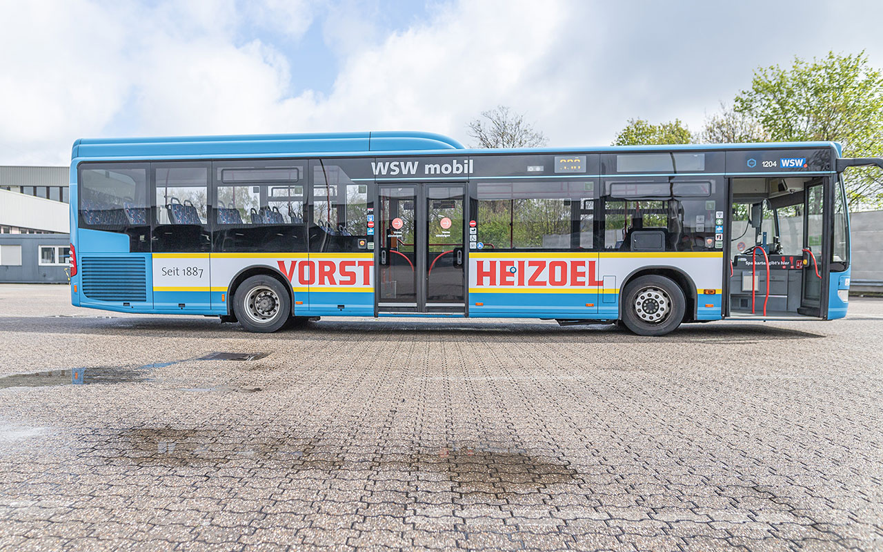 Sicher haben die meisten Wuppertaler die Tank-LKW in den Farben Gelb und Rot vor Augen. Sie sind tagtäglich im Stadtgebiet im Einsatz und schon wegen ihrer Größe sehr präsent. VORST HEIZÖL ist seit Jahrzehnten Teil des öffentlichen Stadtbildes in Wuppertal. Daneben fahren auch Busse mit dem markanten Schriftzug durch das Tal. Wir haben den Stadtwerken einen Besuch abgestattet und uns angeschaut, wie die neuesten Fahrzeuge von den Montageprofis beklebt werden.